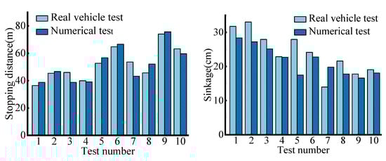 The calibration results show that the stopping distance data of the numerical simulation test and the real vehicle test are basically consistent in a reasonable range. However, the calibration error of the stopping distance in the experiment is small, and the sinkage error is large. There are two main reasons: (1) In the real vehicle experiment, because the ruts are rolled by the front wheel and the rear wheel will be rolled repeatedly, the numerical simulation settlement value is generally smaller than that. (2) The numerical experiment adopts a two-dimensional model, which is different from the actual particles in terms of fluidity.