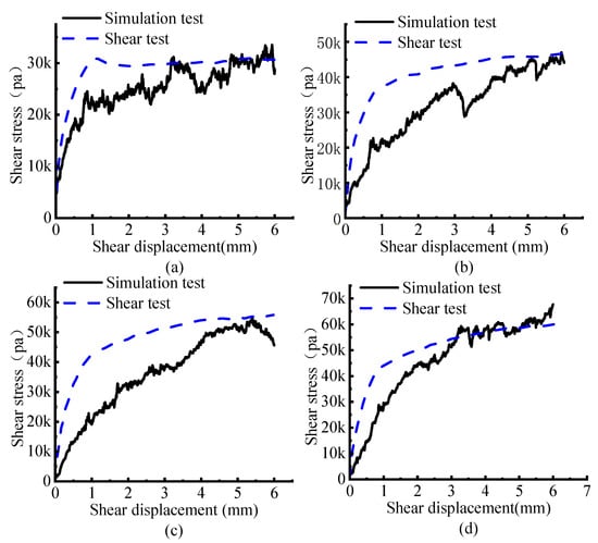 Shear stress–displacement curve. (a) Vertical pressure 60 kpa. (b) Vertical pressure 120 kpa. (c) Vertical pressure 180 kpa. (d) Vertical pressure 240 kpa.