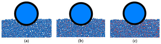 When the soil content in the contaminated aggregate is 0–15%, as shown in Figure 9, the soil particles mainly exist in the gap with the aggregate skeleton. In this state, the soil content in the contaminated aggregate is relatively small, and the mobility limitations of the aggregate are limited. The internal contact state of the aggregate is mainly dominated by the rigid contact between the gravel particles, and the macroscopic mechanical performance of the aggregate is similar to that of the nonpolluting aggregate. When the aggregate in this state is subjected to the pressure of the incoming wheel, it can destroy the bond contact between a small amount of soil particles under pressure and shear force, and only a small amount of soil particles can show the bond characteristics. Moreover, compared with the nonpolluting aggregate, the polluted aggregate particles will increase the aggregate’s positive stress and shear stress to the wheel to increase the resistance in the horizontal direction. In contrast, the fluidity changes and the wheel subsidence is reduced. As shown in Figure 10, when the soil content in the contaminated aggregate is 5%, the stopping distance of the uncontrolled vehicles on the aggregate in this state is slightly shorter in the case of little change in subsidence. In summary, when the soil content in the contaminated aggregate is 0–15%, the aggregate is in good condition. Compared with the stopping distance of the nonpolluting aggregate, the change in the stopping distance is less than 5%. It is not necessary to maintain the aggregate, and its performance is consistent with that of the nonpolluting aggregate.
