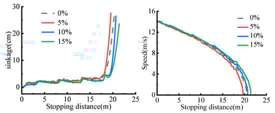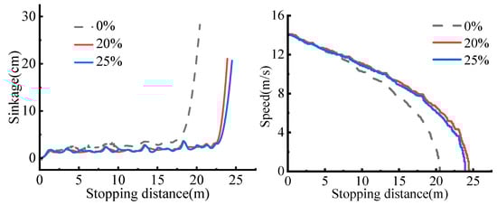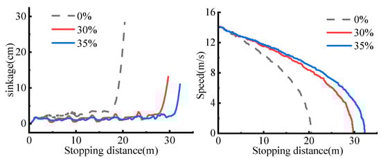 As shown in Figure 13, when the soil content in the contaminated aggregate reaches 30–35%, the soil particles are filled between the aggregate particle skeletons. The influence of cohesive contact of soil particles on the aggregate is further enhanced. With the increase in cohesive contact, the aggregate’s overall shear and compression resistance are enhanced, and the subsidence of the wheel is further reduced. As shown in Figure 14, the stopping distance increases by more than 50%, which makes the original reasonable truck escape ramps fail to meet the design requirements, resulting in the vicious accident of the uncontrolled vehicles rushing out of the truck escape ramps. At this time, the soil content in the aggregate is too much. Even if the aggregate is maintained by loose and refurbishment methods, the fluidity will decrease significantly again in a short time under the influence of rainwater and the gravity of the aggregate particles. It is suggested that the aggregate at this time be sieved or replaced.