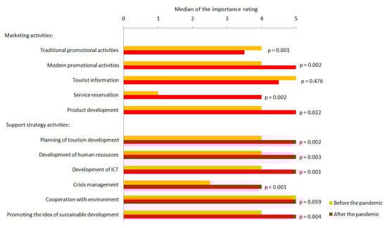 Assessment of the importance of selected activity forms of DMOs in the period before the pandemic and after the pandemic on a 0–5 scale—Wilcoxon’s test for differences. Source: own elaboration based on the survey.