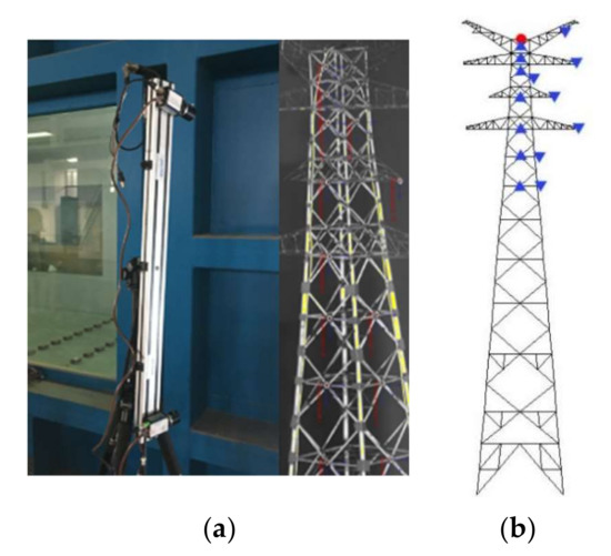 To increase the recognition accuracy of the vision-based measuring instrument, paper targets were arranged at the measuring point. The vision-based measuring instrument was arranged outside the wind tunnel (Figure 4a). Figure 4b shows the arrangement of measuring points. The circle in Figure 4b indicates the position of the acceleration measuring point, and the triangle indicates the position of the displacement measuring point.