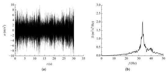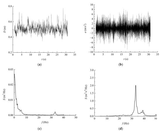 The displacement and acceleration can be expressed as the power spectrums and are shown in Figure 7c,d and Figure 8b,c. The Welch algorithm is used herein, which returns the power spectral density (PSD) estimate of the input signal found using Welch’s overlapped segment averaging estimator. The input signal is divided into the longest possible segments to obtain as close to but not exceeding 8 segments with 50% overlap. Each segment is windowed with a Hamming window. The frequency spectrum of the displacement shows that the displacement is dominated by the background response. In addition, the frequency spectrum of the acceleration shows that the acceleration is mainly dominated by the first-order resonant response.