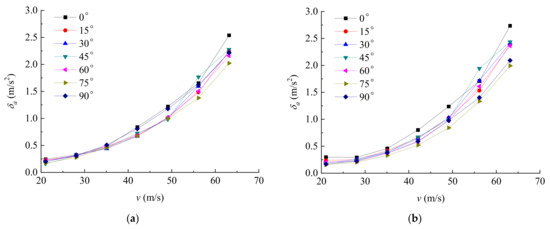 Figure 9 shows the standard deviations of accelerations atop the tower with various wind speeds. It can be found that the accelerations increase with an increase of wind speed. The accelerations in the x-direction and y-direction at various wind incidence angles are almost equal, indicating that the crosswind and along-wind responses are of the same magnitude; similar results can also be found in the field measurement done by Ballio et al. [5] In the structural design of tower, the responses both in the x-direction and y-direction should be considered.