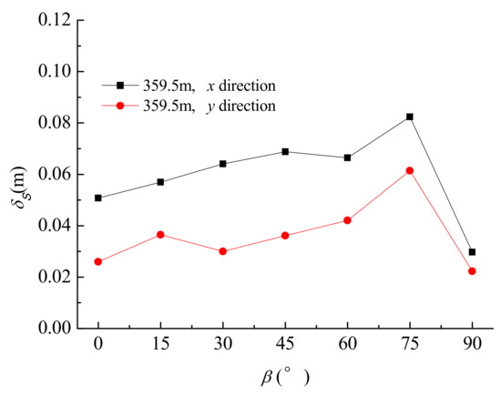 Figure 12 shows the standard deviation of the displacement under different wind incidents at 359.5 m. The maximum standard deviation of the displacement in the y-direction and x-direction appears at the wind incidence angle of 75°. The standard deviation of displacement in the x-direction is greater than that in the y-direction. When the wind incidence angle is 90°, they tend to be consistent. Therefore, the influence of wind incidence angle on the wind-induced response of the tower should be considered in the structural design. Furthermore, since the standard deviation of displacement in the crosswind direction at most angles is significantly larger than that in the along-wind direction, it should be given more attention.