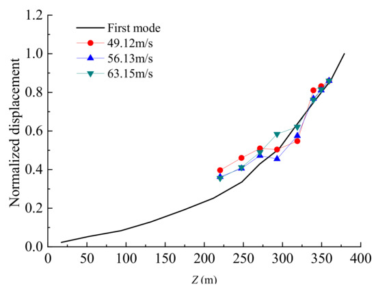 Figure 13 shows the normalized displacement in the y-direction at wind incidence angle 0° when the wind speeds are 49.12 m/s, 56.13 m/s, and 63.15 m/s at 260 m. The first-order mode shape is also plotted in the figure. It can be seen that the measured displacement is almost distributed according to the first-mode shape; therefore, the first-order mode can be used to fit the measured displacement. Then, the test results of the aeroelastic model can be substituted for φ1q1 in Equations (11) and (12) to obtain the gust response factor of the tower.