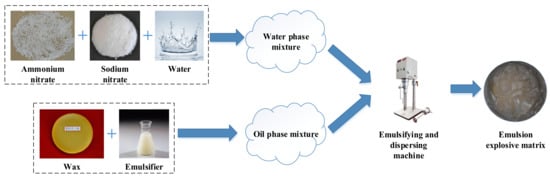 Compositions of EE matrix are shown in Table 1. Ammonium nitrate, sodium nitrate, compound wax, and emulsifier are all industrial products. These products were sourced from chemical plants in China and had a purity of up to 99%. The emulsifier was a PIBSA derivative. The wax was a special compound wax for explosives, which was composed of oily waxes in different distillation ranges and a variety of additives. The weight of impurities was no more than 0.05%. The production process of EE matrix is illustrated in Figure 3. The procedure for EE matrix preparation included three steps. Firstly, ammonium nitrate, sodium nitrate, and water were mixed and heated up to 110 °C to make a water phase mixture. Secondly, the wax was mixed with an emulsifier at 90 °C to make the oil phase mixture. Thirdly, the water phase mixture and oil phase mixture were mixed under the speed of the emulsifying and dispersing machine at 1200 r/min, 90 °C for 2 min to make EE matrix. Finally, the powder of sulfide ores and pyrite samples were mixed with the emulsion explosive matrix and ammonium nitrate, respectively (Figure 4). Four kinds of samples were prepared, i.e., (a): 100% emulsion explosive matrix, (b): 50% sulfide ores and 50% emulsion explosive matrix, (c): 100% ammonium nitrate, (d): 50% pyrite and 50% ammonium nitrate.