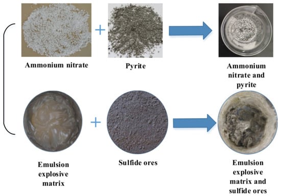 Sulfide ores include various sulfide minerals that are essential raw chemical materials for promoting the development of the chemical process industries and agriculture in China []. As a type of industrial explosive, the emulsion explosive (EE) is widely used during the mining process for sulfide ores. Sulfide ores may be oxidized with oxygen and water and thus release a large amount of heat, which may result in heat accumulation and temperature rising in blast holes. This may induce the premature detonation of EE. Moreover, the mineral consumption of China has increased dramatically and mining depth increases annually to meet the needs of spectacular economic growth []. At the same time, deep mining inevitably brings a series of problems to the mining process, such as in situ stress increasing and the temperature rising, which risk the self-detonation of EE. In the past few decades, several spontaneous explosion accidents have happened in high-sulfur mines all over the world, such as the Meikle gold mine in the USA, Mt Con Gold Mine in Canada [], Dongxiang Copper Mine and Yunfu Pyrite in China. While the risk of fires (and, hence, significant damage) can be mitigated by leaching, the use of explosives is another factor that can increase fire risk, due to reactions between the ores and EE []. Therefore, a systemic understanding of the reaction between sulfide ores and emulsion explosives/emulsion explosive matrix is essential for preventing, controlling, and mitigating fire and explosion risks.