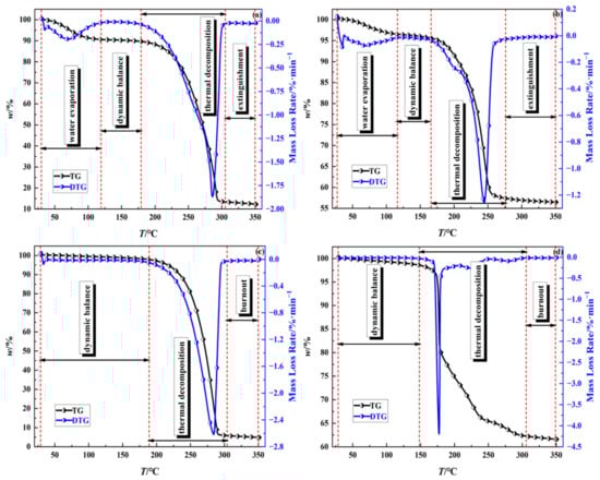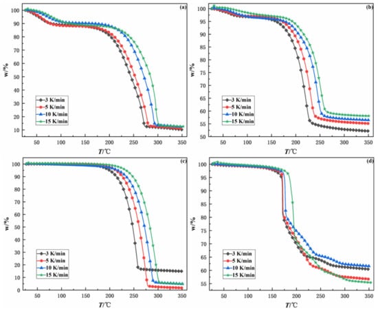 Since TG-DTG curves of the samples followed the same trend at different heating rates, the heating rate of 10 K/min was taken as an example to analyze the thermal decomposition behavior of the samples (Figure 7). According to Figure 7, the masses of samples (a) and (b) underwent four processes: slight decrease, constant, dramatic decrease, and gradual stable, while the masses of samples (c) and (d) experienced three processes: constant, dramatic decrease, and gradual stable.