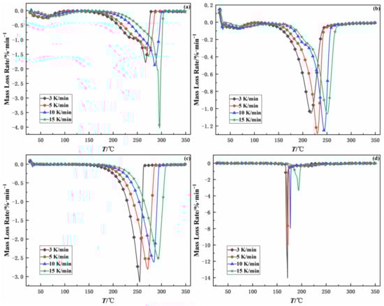 DTG curves of four samples at different heating rates. (a): 100% emulsion explosive matrix, (b): 50% sulfide ores and 50% emulsion explosive matrix, (c): 100% ammonium nitrate, (d): 50% pyrite and 50% ammonium nitrate.