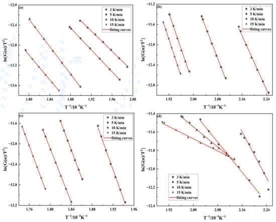 Integral and differential methods are usually adopted to calculate apparent activation energy [,]. Besides, the calculation error of the integral methods is more minor. The Coats–Redfern method is the most commonly used non-isothermal reaction mechanism function, which is categorized as an integral method and can fully consider the influence of the reaction mechanism on the calculation results []. In this study, the Coats–Redfern method was applied to determine the activation energy of the four samples at different heating rates.