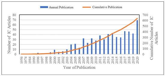 The annual and a cumulative number of research articles in intellectual capital indexed in Scopus from 1956 to 2020.