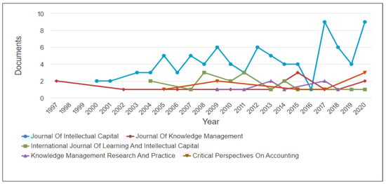 Questionnaire survey-based study was coded by assigning specific numerical values for the current bibliometric paper to illustrate the five (5) most productive journals in Scopus data for the intellectual capital field (see Figure 3), owned by eight (8) different publishers (see Appendix A). Emerald and Inderscience published the first three productive journals. In contrast, the rest were published under Elsevier, Taylor & Francis, World Scientific, Multidisciplinary Digital Publishing Institute (MDPI), Primrose Hall Publishing Group, and Wiley-Blackwell. The journal with the highest total publication was the Journal of Intellectual Capital (intellectual capital) with 88 articles, followed by the International Journal of Learning and Intellectual Capital with 17 articles, the Journal of Knowledge Management with 14 total publications. International Journal of Management Reviews had the highest cited score with 20.8 and a total publication of 4 articles. However, the Journal of Knowledge Management Journal of intellectual capital has the most cited paper with 361 citations. Moreover, Appendix A has been provided for the more productive journal in the intellectual capital area, ranking the journals for the top fifteen (15) productive journals.