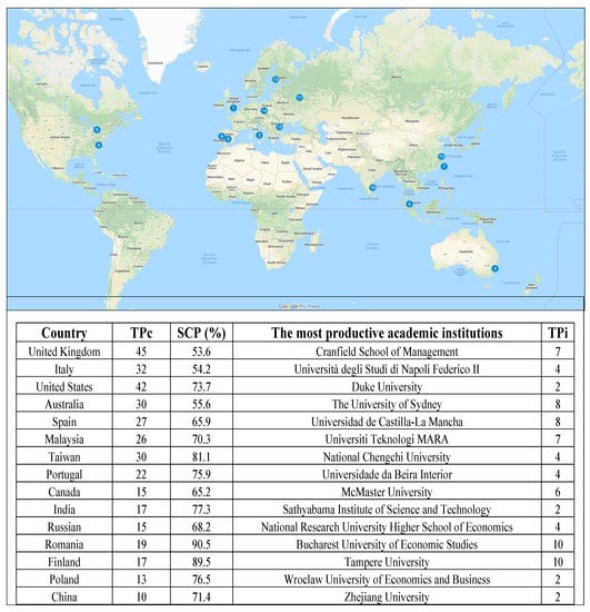 The present study showed that the top 15 countries contributed to the growth of intellectual capital studies globally. About 23% of global publications were contributed by the United Kingdom and Italy, indicating these two countries are key players in the progress of intellectual capital research. With 45 publications, the UK was the most productive country. Italy was the second most fruitful country. However, the total publications (TPi) from Universiti Degli Studi di Napoli Federico II were slightly lower than that of Cranfield School of Management in the United Kingdom, with 7 and 4 publications, respectively. Figure 4 lists the most productive institutes in each country, based on the number of publications in the intellectual capital area; the present study also illustrates the most productive institutes in the area of intellectual capital ranked from 1 to 20, with the total number of publications shown in Appendix C. Figure 3 shows that only Romania (90.5%), Finland (89.5%), Taiwan (81.1%), India (77.3%), Poland (76.5%), Portugal (75.9%), the United States (73.7%), and Malaysia (70.3%) had more than 2/3 single-country publications (SCPs). This indicates that these countries have a high level of intra-country cooperation. However, the United Kingdom was the nation with the lowest SCP with 53.6 percent, where 39 out of 84 articles were related to numerous connections. That signifies that United Kingdom publications were internationally collaborative papers, linked with more than 20 nations, and it was rated the first most active country in international collaborative studies. Figure 4 shows the top fifteen most productive countries and academic institutions in intellectual capital publications.