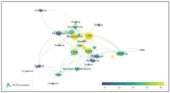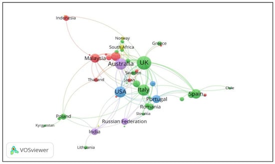 The screenshot of the bibliometric map created based on countries’ publications with network visualization mode. as shown in Figure 5 and the following link: https://bit.ly/30p7K7C/ accessed on 12 June 2022.