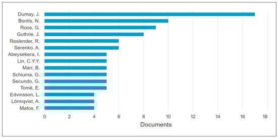 Figure 8 outlines the 15 most prolific intellectual capital authors from nine nations, including Australia (4 authors), Canada (2 authors), Italy (2 authors), Portugal (2 authors), Denmark, Taiwan, United Kingdom (Sweden), Sweden (Taiwan), and Finland (1 author). The most prolific publisher has published works between 1999 and 2020. The authors’ affiliations show that intellectual capital research has been within fields related to intangible resources, business, and management. John Dumay from Australia has the highest publication in the intellectual capital field with 17 total publications from 2017 to 2020, 14 h-index, and 1633 citation times. Moreover, the second-highest author was Nick Bontis from Canada, affiliated with McMaster University of Hamilton, Canada, with total publications of 10 and 1242 citation times. The third and fourth authors were from Australia and affiliated with different universities with citations of 666 and 981, respectively. The authors of the most cited papers in Appendix A may not appear in Appendix C, which lists the most frequently cited articles. If they had published a lot, such as Guthrie, J., Abeysekera, I., and Marr, B., their names would appear in both tables. See Appendix C for more details about the top fifteen most productive authors in intellectual capital research.