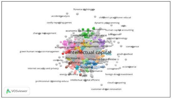 Search output patterns were compared between the major topic (keyword co-occurrences) and the sub-theme (total publication). Keywords like “intangible assets,” “knowledge management,” and “human capital” were all counted and displayed in VOS viewer software when it came to assessing the deployment of intellectual capital. In addition, we evaluated the five nations with the most publications for every intellectual capital usage.