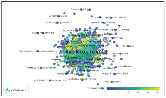 The term occurring most often in our research was ‘intellectual capital,’ with 351 occurrences and 1447 linkages to other keywords (see Figure 9). Additionally, we noticed the use of broad phrases, such as ‘knowledge management (85 occurrences, 330 links) and ‘human capital’ (49 occurrences, 226 links). Intellectual capital co-occurred with conceptual keywords, including ‘innovation,’ ‘performance,’ and ‘knowledge’.