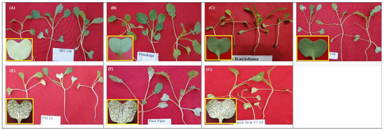 Symptoms caused by Albugo candida isolate Ac-Dli on the abaxial surface of cotyledonary leaves of resistant and susceptible genotypes under artificial epiphytotic conditions. Resistant genotypes: BEC-144 (A), Donskaja (B), Pusa Karishma (C), and BIO YSR (D), whereas susceptible genotypes: PM-24 (E), Pusa Vijay (F), and MSTWR-17-15 (G).