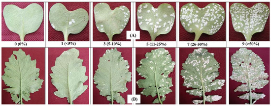 Photographs depicting the disease rating scales (0–9 scale) used for screening parental genotypes and segregating populations against white rust at the cotyledonary (A) and true leaf stage (B). Values in parentheses denote the percent area of leaf covered by white blisters of disease.