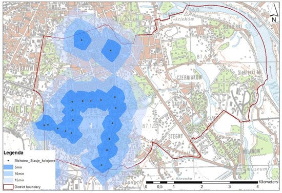 - Transport accessibility of the area—time (according to Jakdojade service, on 25 July 2022 at 10:00 a.m.) from the nearest railway station (Warszawa Zachodnia, Centralna, or Wschodnia) to the nearest bus stop, tram stop, or local train station + time of walking access to the area (based on the analysis of isochrones within 5, 10, or 15 min). If the site could not be reached within 15 min from any tram stop/train station, the attribute was given the value NULL (Figure 5).