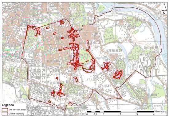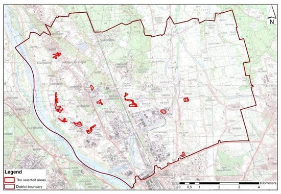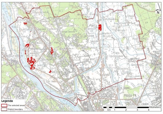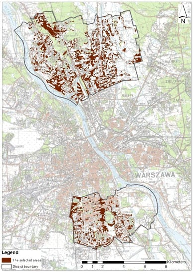 The following were then eliminated: forest areas (as defined by the Forest Act) [39], land with a compact area of at least 0.10 ha, selected protected areas whose presence significantly limits the possibility of land development (Natura 2000 areas, nature reserves, national and landscape parks), areas intersecting with roads and directly adjacent to them, and areas unsuitable for development given the carrying capacity criterion (all organic soils) and the humidity criterion (soils of agricultural suitability complexes 1z, 2z, 3z, 8, and 9) [40]. In the next step, areas smaller than 4000 m2 were excluded due to the assumption of use for functions of public interest. For the regions selected in this way, the ownership of the land was determined (with a division into State Treasury land, land owned by the Capital City of Warsaw, and private land) and its designation in local spatial development plans, as well as the possible occurrence of historical contamination of the land surface, based on available lists obtained from individual districts and the register of the General Directorate for Environmental Protection.