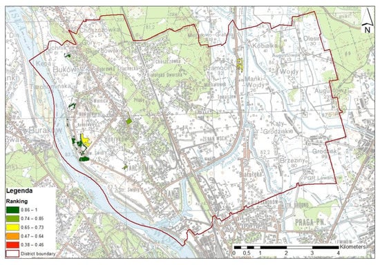 As part of the implementation of the study, a database of land reserves within the two analysed districts was created. The primary data sources included the database of topographic objects that were available to the Capital City of Warsaw and lists of potential historical land contamination obtained from the district offices. Using this information, prospective areas were selected that could serve as reserves and be developed in crises; these areas included post-industrial areas, disused areas, sports facilities, agricultural areas, and green areas. Data on historical land surface pollution for the Capital City of Warsaw area were also acquired. In addition, data collected from these databases were supplemented with data from the land and building register concerning ownership and the findings of decisions on land development conditions and location of public purpose investments. The database created in this way formed the basis for the decision-making model described above.