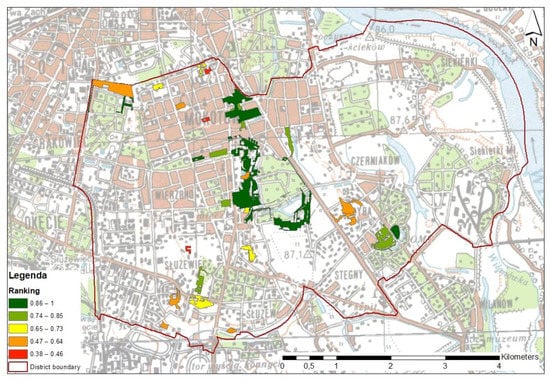 Each selected area under each criterion could receive a value from 0 (worst case) to 1 (best case). These values were then multiplied by the criterion weights to produce a summary suitability index value and a final ranking (Figure 14). Areas with values close to 1 should be considered first as a suitable designation for the location of recreational areas and public open spaces.