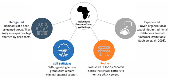 Indigenous female entrepreneurial activities flourished where colonial interest was absent. So we see them today “overrepresented” in small-scale or micro-enterprises in retail trading (textiles, food supply), catering, service industry, agro-processing, agriculture, textile and fabrics (weaving kente, aso-oke), handcraft making (jewelry, beads, pottery), and manufacturing (soap, cosmetics, shampoo) [25]. They are present as community groups, self-help associations, religious organizations, tribal groups, and women’s political parties [36]. Each is self-sustaining because they are self-funded, typically through the Indigenous female trading associations. Indigenous female institutions require minimal external support and enjoy a unique privilege afforded by their deeply entrenched roots, which span millennia [6,7,8,9]. Female Indigenous organizations are efficient, self-structured, and locally respected: “Indigenous institutions anchored in local culture and values can count on the sound pillars of legitimacy, accountability, and self-enforcement. They have a strong hold on people’s commitment, dedication, and sense of identity” [37]. Figure 1 illustrates aspects of the African Indigenous female institution’s heritage relevant to this research. These features make them an untapped resource for the management of organic waste. The social cohesion capacities traditionally held by women within their families and communities are well documented [3,36,38,39]. This study will leverage these connections because Indigenous female-specific relationships have produced culturally unique capital acquisition and mutual assistance results [27]. “If we are to find useful solutions to under-development… economic analysis will have to turn to the cultural realm. The mainstream of economic inquiry unfortunately offers little opportunity to explore the connections between cultural processes and economic development” [27]. Results of this research will provide insights into the connection between culture and economic improvement, thus providing practical answers.