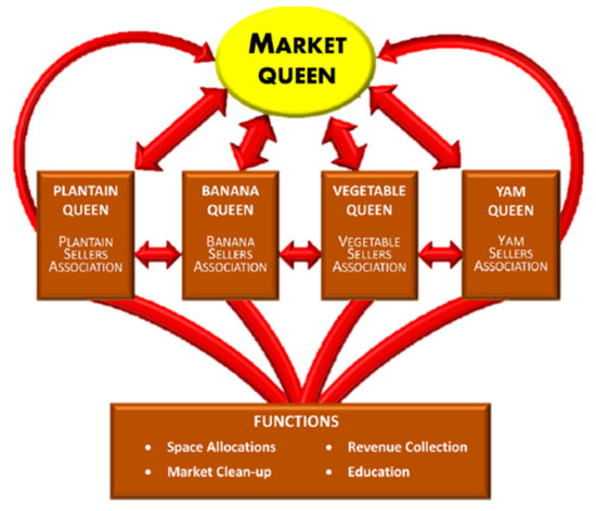 These Indigenous organizations’ self-organizational skills and institutional credibility were apparent in the waste management pilot study of a Ghanaian market by Asomani-Boateng. The Indigenous female institution in the study is the Market and Commodity Queens, and they self-organized to manage an independently run composting program [5]. Indigenous open-air markets typically have an overall or supreme leader; in this instance, it is the “market queen.” The entire market is organized around her, the commodity queens, and the market associations. Each commodity queen answers to representatives in a constituency or market association made up of traders. The commodity queens and market queen manage the marketplace. The author proposed a solution to their waste challenge, detailing the resources required, and then the market queens self-organized to execute the project [5]. In the Asomani-Boateng study, they informed and urged their members to participate in the study through waste separation. They organized the collection points, times, and compost setup, including allocating a compost site and instructing the workers on composting requirements. However, the study was constrained due to spatial limitations typically experienced in urban locations. The organizational structure of the Indigenous institution, illustrated in Figure 2, was vital for sustaining this level of cooperation. As a Ghanaian market queen succinctly put it, “without doing on the grassroots, you can’t work at the top. Nobody can jump from outside” [45]. Without Indigenous female-led institutions as champions, sustained change cannot be achieved in African societies [5,45]. Formal institutions, government-run entities, were imposed on Africans through colonization, and these institutions have remained disconnected from the communities they are intended to serve [44]. This has led to citizen reluctance to step in to assist government municipal solid waste management shortcomings.