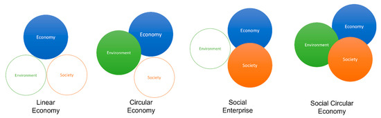 The social circular economy (SCE) satisfies the circular economy’s social consideration requirement by integrating the circular economy’s environmental principles with the societal focus of social enterprises [57]. The model fully considers all three pillars of sustainability, i.e., environment, society, and economy: “social circular economy is an operating model to ensure that the economy does not harm society or environment and in fact benefits both society and environment the more of it that takes place” [57]. The differences between linear economy, CE, social enterprise, and SCE are demonstrated in Figure 4. The framework was successfully tested on 31 small- and medium-sized enterprises (SMEs) in Latin America and South Asia, i.e., countries with low labour costs that allowed for “a more human centered recovery” approach [57].