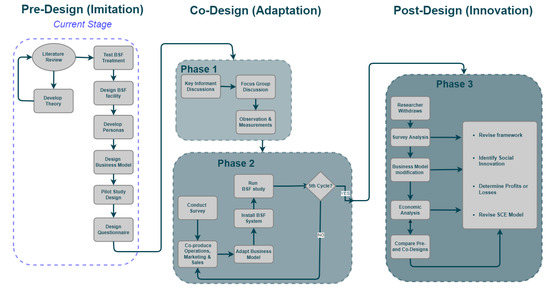 A three-staged methodological approach was proposed for this research (see Figure 5). Pilot studies are recommended to design a BSF system [1]. Consequently, a pilot study was planned to use collaborative approaches unique to the Tanzanian location and its stakeholders to answer the following questions: