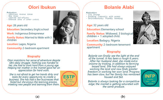 People make up IFÉs, so personas were developed to better understand their motivations, interests, and personalities. The personas were developed based on crucial roles such as a BSF champion (Figure 8a)—a position recommended by the social circular economy business model [22]. Another persona is the agriculturalist, a co-collaborator and partner of the BSF initiative (Figure 8b). The personas provide a clearer perspective on the potential candidates that might be interested in the project roles. They will be revised upon the completion of the field surveys and interviews.