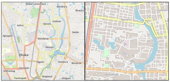 Map of Dhaka City (left) and Korail Quarter between Banani and Mohakhali (right) (Source: OpenStreetMap).