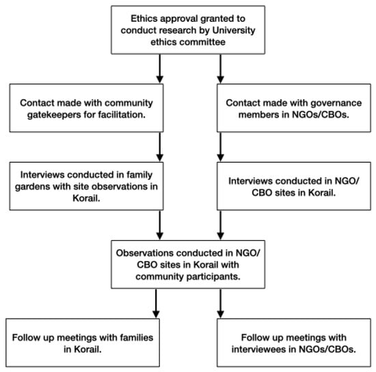 In total, we undertook semi-structured in-depth, qualitative interviews with 13 local NGOs and five CBOs during two stints of fieldwork. Fieldwork lasted for three consecutive months (October–November 2016 and January 2017). In addition, in 2018, the research team revisited the NGOs and CBOs for follow-up interviews to gather further data and gain updated information on their activities. The interviews lasted, on average, an hour using the local language (Bengali) and the notes were translated into English by one of the authors, who is a native speaker. The research process involved multiple semi-structured interviews accompanied by field-site observations (Figure 2). Following the granting of ethics approval, the research team contacted families in Korail via key ‘gatekeepers’ who are respected leaders or elders in the community. These individuals facilitated access to relevant families and households who had undertaken activities with NGOs and CBOs sites and applied them to their own situations. The team also contacted the leadership of NGOs and CBOs and were introduced to participants with expertise in the topic area. Site visits involved observations of slumdwellers engaging with the NGO and CBO sites in Korail. Following the fieldwork period, the research team followed up with the participants to ask further questions and to receive updates on their latest interactions with the topic area.