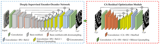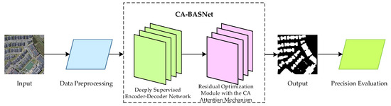 The BASNet network was proposed by Qin et al. [16] in 2021, and the network was originally used for edge enhanced segmentation of salient objects. This deep network has good integrity when the target boundary is extracted, and the segmentation result has high accuracy. Therefore, BASNet is used as the network foundation model in the proposed method. The BASNet network is mainly composed of two modules: a deeply supervised encoder–decoder structure and a residual optimization module. The deeply supervised encoder–decoder structure is a segmentation target prediction model, which captures global and local context information to improve the accuracy of building extraction. Then, the extracted feature map is passed into the residual optimization module to improve the uncertainty and rough edge of the image’s region. However, the spectral information of some buildings and ground objects in the image is similar and the roof scale is different, leading to adhesion and error detection during extraction. To solve the above problems, the CA-BASNet network is proposed in this paper, and its network is shown in Figure 2.