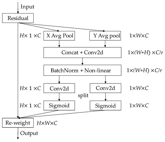 - The two feature maps were concatenated and sent to a convolution module with a shared convolution kernel of 1 × 1, and its dimension was reduced to the original C/r (C represents the number of channels, r represents the compression ratio parameter). After batch normalization, the feature map of 1 × (W + H) × C/r was obtained.