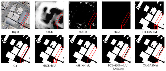 In order to verify the effectiveness of the network proposed in this paper, an ablation experiment was performed on the WHU building dataset. The BASNet network, the network with different combinations of loss functions, and the proposed network were selected as comparisons, and mIoU, mPA, precision, recall, and F1 were selected as evaluation indicators to evaluate the accuracy of the network. Table 5 shows the results of the ablation experiments. As can be seen in Table 5, BASNet and the proposed network have strong adaptability to building scenarios, and overall accuracy has achieved good extraction results. The mixed loss network BASNet used in this paper has a better overall performance than other loss function combination networks, and the proposed network CA-BASNet has the best performance for each index. Compared to BASNet, CA-BASNet improved by 3.33% in mIoU; in mPA, it increased by 1.98%; mean recall was increased by 0.39%. Precision increased by 2.69%; gain 1.43% in F1. The buildings tested by each network were selected for visualization. From Table 5 and Figure 10, it can be seen that the extraction effect of the proposed network is significantly better; the missed detection rate is reduced, the adhesion problem is improved, the edge segmentation is also relatively complete, and the overall accuracy is higher.