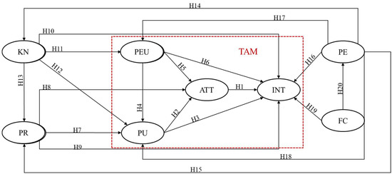 Perceived risk negatively affects users’ attitudes and intentions to accept and use innovative technologies [48,51], as well as perceived usefulness. Brecht et al. [62] and Ward et al. [63] pointed out that users with higher knowledge of AVs have more positive use intentions, which could also positively impact perceived ease of use. When users have a high level of understanding of new technology, the perceived risk is generally lower, and they are more likely to recognize that the new technology could bring benefits [44]. Based on the above discussion, the hypotheses are as follows: