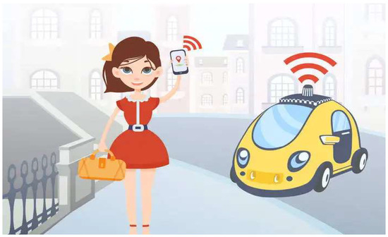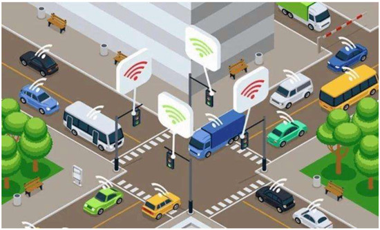 Scenario 1 (see Figure 2): Level 5 AVs drive automatically and do not need a driver’s manual operations. AVs keep a safe distance from other cars at an intersection by interacting using intelligent devices. They avoid pedestrians and other cars by themselves with a sensing system. AVs can complete operations such as overtaking, lane changing, distance keeping, speed adjustment, and other operations on the way.
