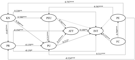 Figure 5 shows the model’s hypothesis test results and path coefficients, where the solid lines represent significant paths and the dashed lines represent the non-significant paths. The results showed that the attitude toward escorting children by AV affected parents’ intentions positively, which supported H1. PU had a positive effect on attitude towards school travel and parents’ intention, verifying H2 and H3. Furthermore, perceived ease of use positively affected perceived usefulness and attitude, supporting H4 and H5. Contrary to expectations, perceived ease of use had no significant effect on parents’ intention, which was inconsistent with hypothesis H6. Perceived risk showed a negative effect on parents’ intentions, attitudes, and perceived usefulness. Hence, H7, H8, and H9 were all supported. Among the proposed hypotheses related to knowledge of AVs, this could positively impact parents’ intentions, perceived ease of use, and perceived usefulness, while negatively impacting perceived risk. Therefore, H10, H11, H12, and H13 were supported. The impact of public engagement on knowledge of AVs and perceived risk was significant, thereby verifying H14 and H15. Unexpectedly, public engagement had no significant effect on parents’ intentions. Therefore, H16 was not supported. Public engagement had significant positive impacts on perceived ease of use and perceived usefulness, supporting H17 and H18. In terms of face consciousness, the results showed that face consciousness could positively impact public engagement and parents’ intention to use AVs, which confirms H19 and H20. In conclusion, except for H6 (perceived ease of use→parents’ intention) and H16 (public engagement→parents’ intention), the other hypothesized path relationships were significant. The standardized path coefficients and significance levels of the paths are shown in Table 5.