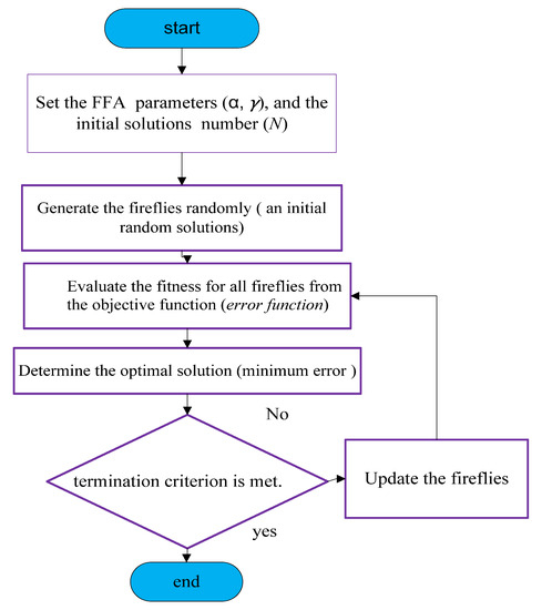 The FFA simulates the fireflies’ flashing behavior and effectively determines the optimal solutions (both global and local solutions) [23]. Every natural firefly exhibits luminous behavior to attract other mates. The attractiveness of the fireflies depends on factors, including the light intensity that the fireflies emit, their size, and location. The idealized fireflies’ flashing behavior occurs through the following scenario. First, each of the fireflies is attracted to other bright fireflies. Second, the fireflies’ attraction is decided by the firefly’s brightness, and it depends on the value of an objective function [37]. This means that any less bright firefly moves towards the brighter one, and if there is no brighter firefly, the firefly will move randomly [9]. The updates of the fireflies will be iterated until reaching the tolerance from the optimum value, or the maximum number of iterations is conducted. Mathematically, the firefly’s new position i about a brighter firefly j is given by Equation (1) [20,38]: