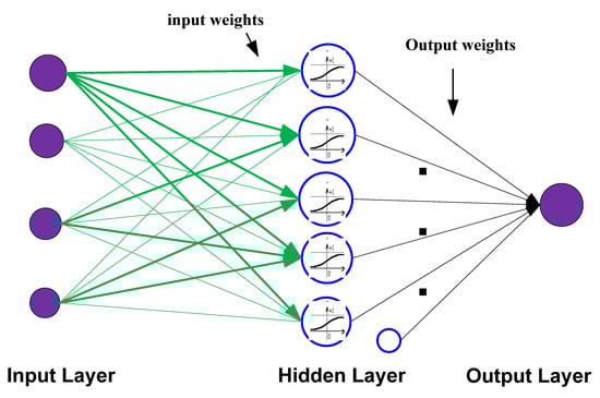 Finding the importance of the parameters of an ANN leads to becoming an ANN model since the supervised learning method of ANNs is the best methodology used to establish the ideal values of all ANN parameters, i.e., the “input weights” and “output weights. This process is called the training process, since the observed data (training data) and optimization algorithms are used in the process (see Figure 3). The error functions, such as root means squared error (RMSE) function, are used as a fitness function for testing the performance of the MLPNNs models, whereas the correlation coefficient (R) is used to enhance the performance. The equations of RMSE and R are as follows [43,44]: