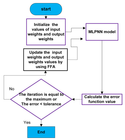 In current years, metaheuristic optimization algorithms have become very popular in artificial intelligence (AI), optimization, engineering applications, data mining, and machine learning [21,22,23,24]. These metaheuristic algorithms are now one of the most widely used techniques for optimization. They have several advantages over conventional techniques. The two most advantages are flexibility and simplicity. Metaheuristic algorithms are highly flexible and can deal with diverse objective functions, either discrete, continuous, or mixed [23,25]. Moreover, these algorithms are simple to apply because of their ability to solve complex problems. They solve several real-world optimization problems in different domains, such as engineering, AI, and operation research. Various metaheuristic optimization algorithms such as Particle Swarm Optimization (PSO), Ant Colony Optimization (ACO), and FFA have been used to find the optimal parameters of the ANNs models [26]. In this study, the FFA is applied as an optimization method to enhance the performance of the ANNs models. Note that, ANNs have effective, robust, and prominent features in capturing the nonlinear relationships between parameters and response in a complex system. FFA has proven that this algorithm has a high ability to search for the global optimum solution. Employing FFA and MLPNNs as tools to predict and improve the Students’ Academic Performance will be very interesting and effectiveness. As a result, an integration of MLPNN with FFA has been undertaken in order to construct a hybrid prediction model for students’ academic performance in blended learning modeling.