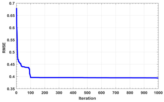 All techniques, such as ANNs, used to predict the students’ performance, take into account different types of data, for example, demographic characteristics and the grades from some tasks. However, each case study has its own characteristics and nature, so different techniques can be selected as the best option to predict students’ behavior. Lu et al. [49] applied principal component regression in the bended learning system to predict students’ final performance. Xu et al. [50] used K-nearest neighbors (KNNs) and gradient boosting decision tree (GBDT) in the blended learning system to the predict of student performance and the possibility of early intervention. Raga and Raga [51] proposed a deep ANN model for prediction of student performance in blended learning. Yang et al. [52] proposed a model for predicting students’ academic performance in blended learning system by using the activities that are homework, quizzes, and video-based learning. As a result, this work differs from previous studies in terms of student activities used in predicting the final grade of students, and in the structural form of the MLPNN model that was established. This is in addition to the use of swarm optimization algorithms to improve the performance of the proposed MLPNN model. In this study, we proposed an MLPNN model with four input neurons, ten hidden neurons, and one output neuron to predict the student’s performance in blended learning. The input data represents virtual/face, midterm exams, assignments, and attendance. At the same time, the output data represents the final grades. Furthermore, several studies have investigated the possibility of improving the accuracy of ANNs by coupling with the Firefly algorithm [53,54]. FFA was used for the training to determine the optimal parameters of the model. Additionally, by choosing the minimum value of the RMSE function, the ANN was trained for 50 trials with 1000 iterations and 50 populations in each test. As a result, the minimum error is RMSE = 0.39, as shown in Figure 5.
