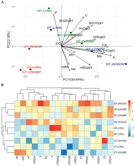 The results of the principal component analysis explained 51.89% (Figure 1A). PC1 explained more variation by 30.04%, and it was mostly loaded by N, Ca, Mg, and K and soil moisture. P, bulk density (positive side), Na, and WIR on the opposite direction mainly formed PC2. Clearly, CT was distinguished from the conservative practices of NT and RT, pointing to the weak content of nutrients, especially CT-W/W/W (Figure 1A). In addition, the CT system with L/W/L and O/W/BP showed higher values of WIR and Na and lower values of bulk density and P. In contrast, conservative cropping systems NT and RT provided higher nutrients, bulk density, and soil moisture (Figure 1A,B). Similarly, the heatmap and hierarchical clustering based on the studied soil properties divided the assessed tillage systems into different clusters (Figure 1B). RT and NT displayed the highest values for most evaluated properties (depicted in red). On the contrary, CT had the lowest values (depicted in blue).