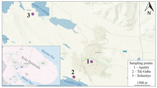 In the urban areas of Russia’s Murmansk region, green spaces are constantly exposed to various types of anthropogenic impacts, which, combined with the prevailing climate, often become the main reason for their unsatisfactory condition. Soils of residential, industrial, logistics, and public utility sites are characterized by an elevated level of pollutants, especially heavy metals [4]. The erosion of these soils leads both to the migration of pollutants in the form of fine dust into the neighboring ecosystems, and to an increase in the reclamation costs associated with eroded landscape areas, embankments, slopes, hydraulic structures, and road surfaces. In addition, as a result of the long-term intensive mining and mineral processing operations in the Murmansk region, a significant amount of fine-grained concentration tailings has accumulated. The surface of the tailings is often a source of increased emission of dust particles into the atmospheric air, causing a negative impact on the ecosystems and public health. One of the two existing tailings storage facilities (TSF) at Apatit JSC, Kirovsk is intended for storing the tailings produced by the operation’s apatite–nepheline Plant 2 (ANOF-2). ANOF-2 TSF is located in the Belaya Bay of Lake Imandra at a distance of approximately 3 km from the nearest residential areas. The tailings storage facility is the largest in the Murmansk region and occupies 1650 hectares. Drying of the tailings surface results in a quick loss of moisture in the top layers, while wind causes dusting, leading to a deterioration of the public health situation in the city of Apatity [5].