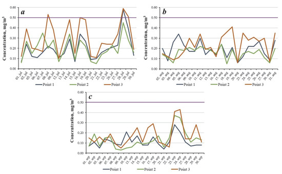 During the rest of the study period, no significant dusting was observed. Throughout August, dust concentrations at the sampling points never exceeded the MPCm.o. values. Average concentrations at sampling points 1, 2, and 3 were 0.19, 0.15, and 0.23 mg/m3. Sampling point 1 is characterized by periodic increases in the concentration of dust up to 0.30 mg/m3, while the curve at sampling point 2 is flatter (Figure 2b). This is probably due to the intensity of city traffic, which contributes to a sharp short-term increase in the dust concentrations at sampling point 1, while sampling point 2 is located at a considerable distance from the city center and is less affected by heavy traffic. In September, the average dust concentrations at all sampling points decreased to 0.12, 0.13, and 0.17 mg/m3, respectively. Some increase in the dust concentration was noted on September 23, which was associated with high wind speed, with gusts reaching 10 m/s (Figure 2c).