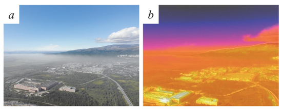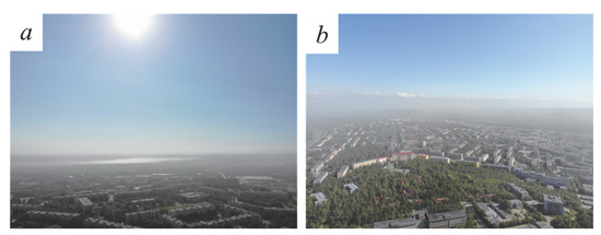 Atmospheric dust pollution over the city of Apatity. View of Lake Imandra (a) and the central part of the city (b).