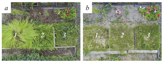 Samples 1 and 2 were characterized by low weed growth throughout the entire study period. This is due to a significant fraction of red fescue in the lawn grass. This species has a strong ability to suppress weeds in the herbage. It was established that this grass species, despite the anthropogenic impact and challenging climatic conditions, had satisfactory growth rates and formed a good quality lawn. After passing a predetermined height, all three samples were mowed. Figure 8b shows the appearance of the lawns after mowing.
